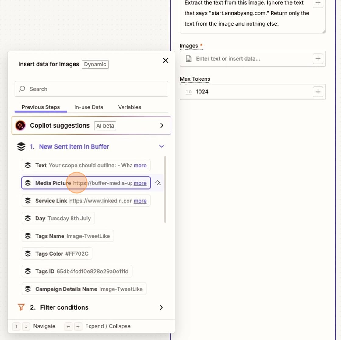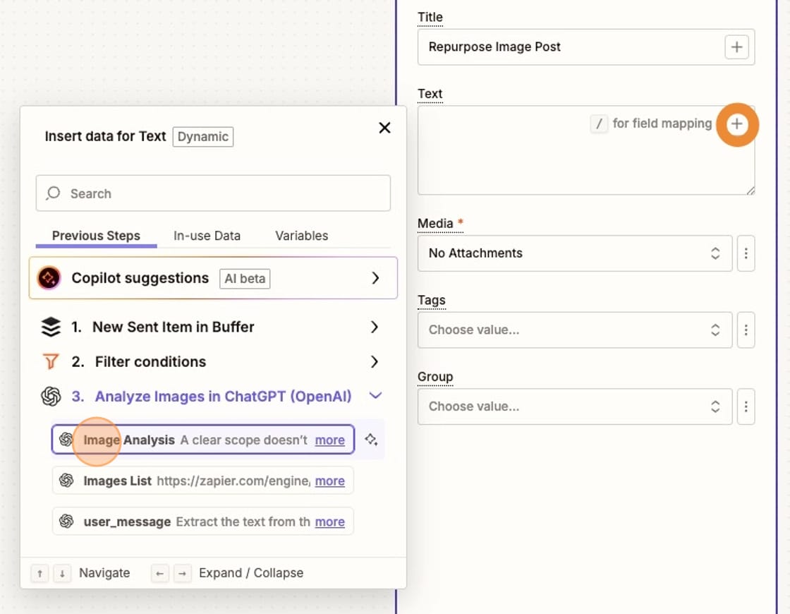 You'll select the "Media Picture" from your Buffer step. This sends the image sent by Buffer through ChatGPT along with your instructions.