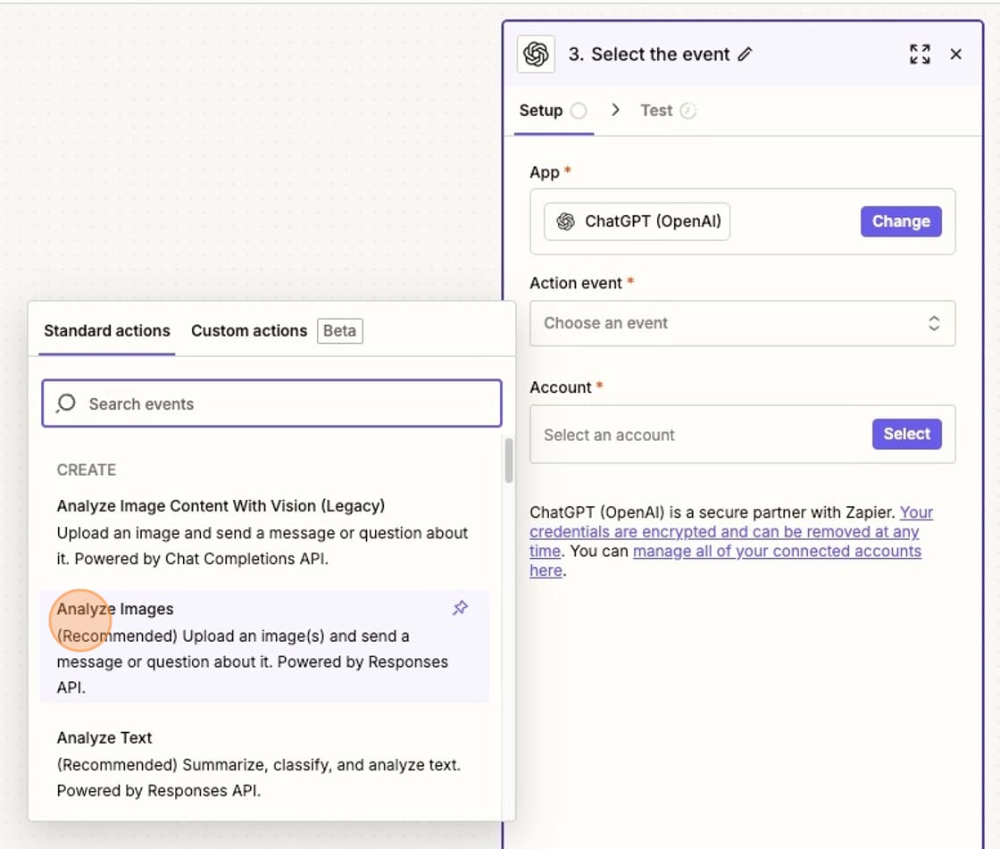 You'll select ChatGPT as the app and an Action Event of "Analyze Images."