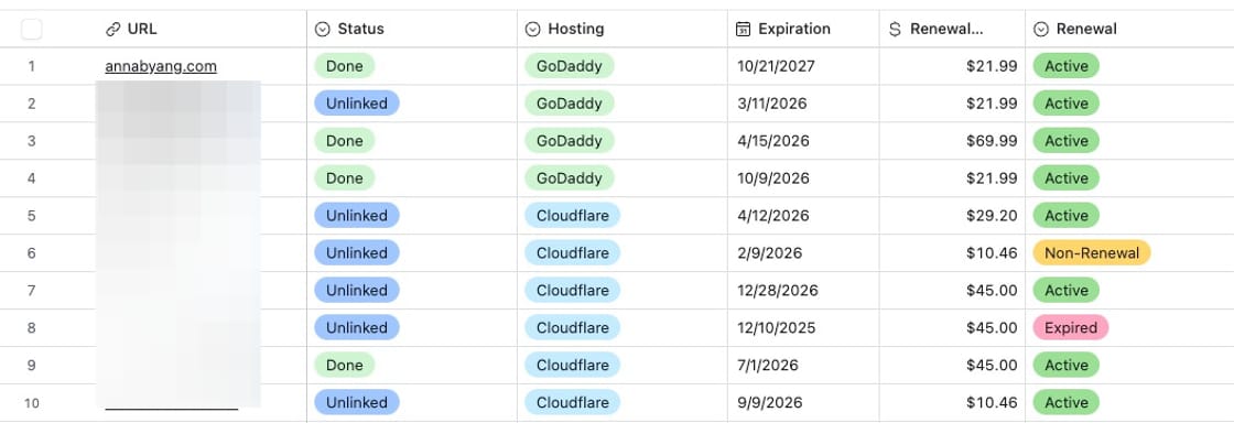 I realized that I needed a centralized place to keep track of my domains. So I built a tracking system in Airtable. [affiliate link*]