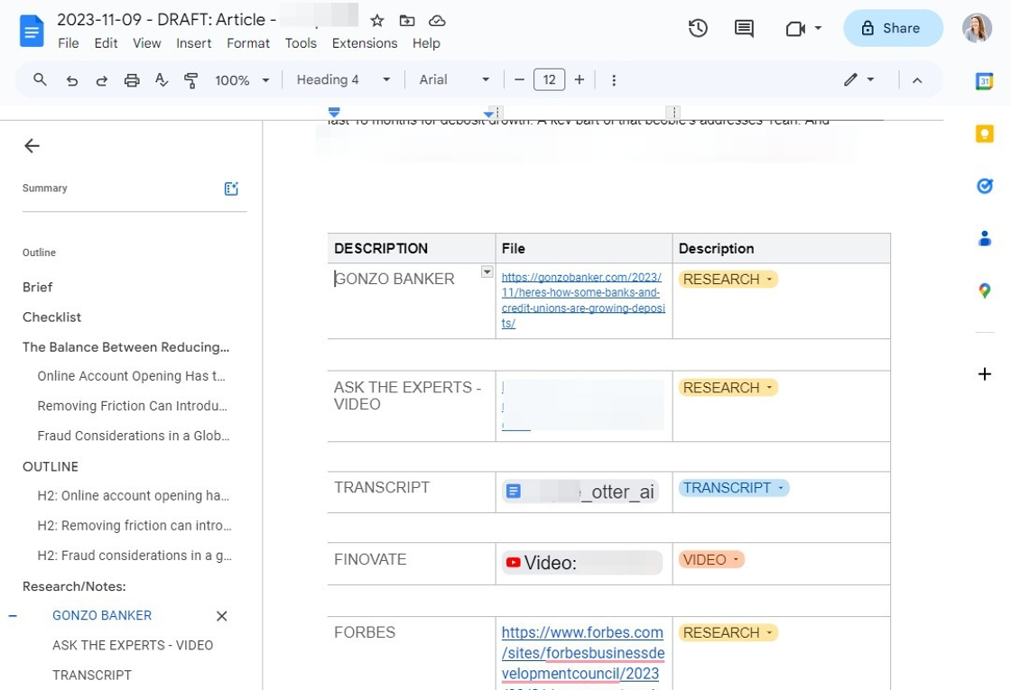 The end result looks like this, which I keep at the bottom of my GDoc. Plus, I format the text with Headers, so I can access my research easily from the Outline menu.
