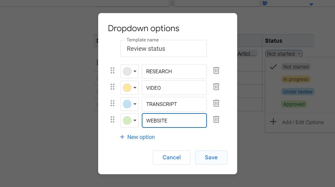 The last column in the Building Block is a drop-down menu. You can edit the options in the menu. Mine reflects the type of research (video, transcript, website, etc).