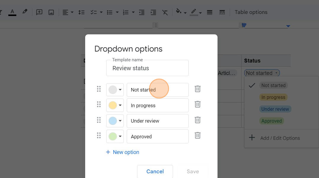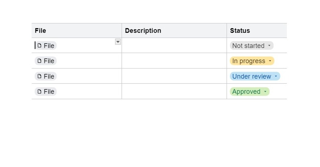 Click into each Status field and change it to something else that makes more sense for your work. You can add more options if needed with New Option at the bottom.