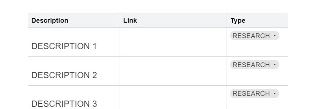 The first column of the Building Block is for other Google Drive files, by default. But my research mostly links to external sources, so I change the first column to be a Description field.