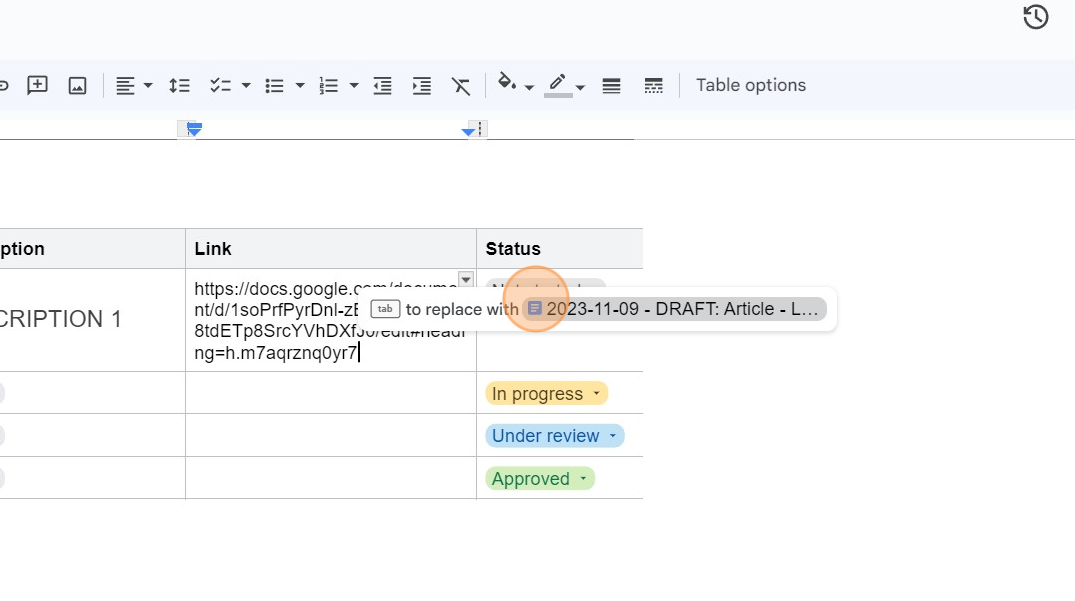When you add files from Google Drive, you'll get a prompt to replace them with a Smart Chip. This makes them easier to identify in your Building Block. Tab or click to replace the URL with the Smart Chip description.