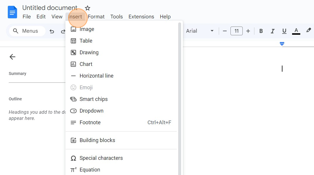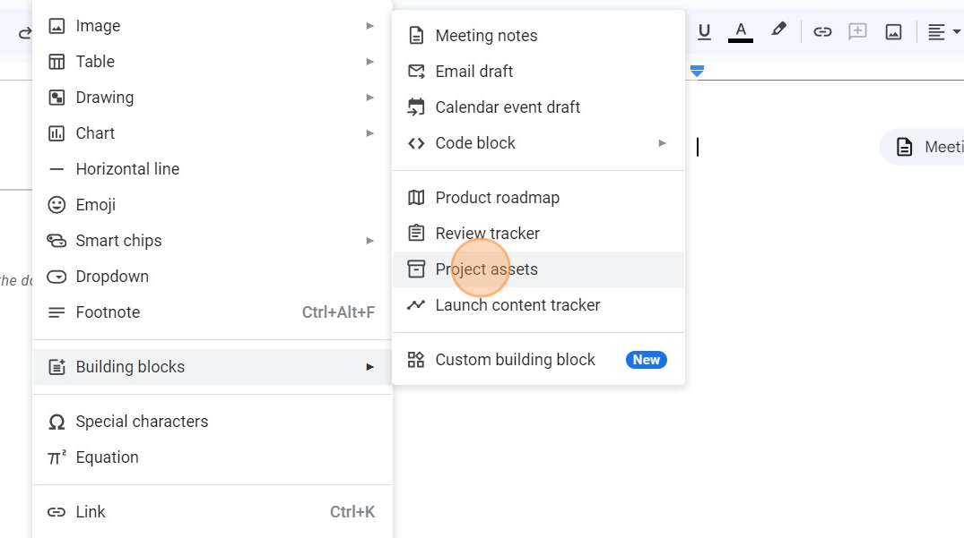 To add a Building Block in your GDoc, to to the Insert menu and select Building Blocks.