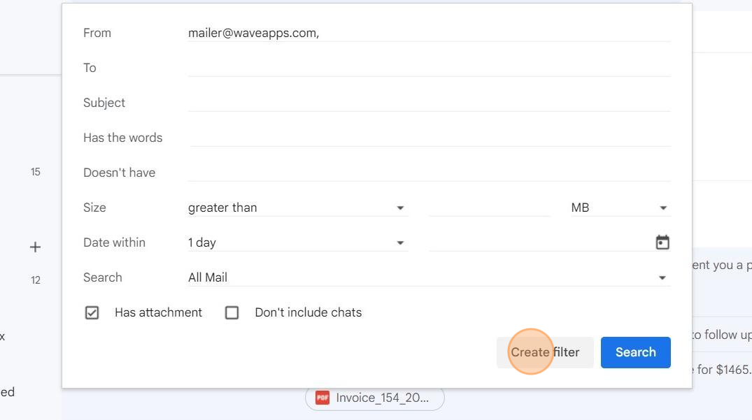 In the filter, I use the check box "Has attachment." Then click on Create Filter.