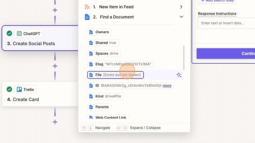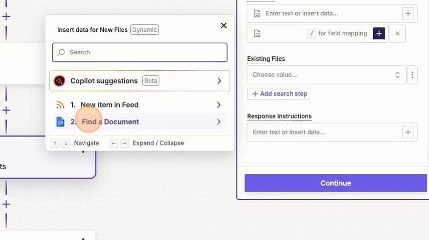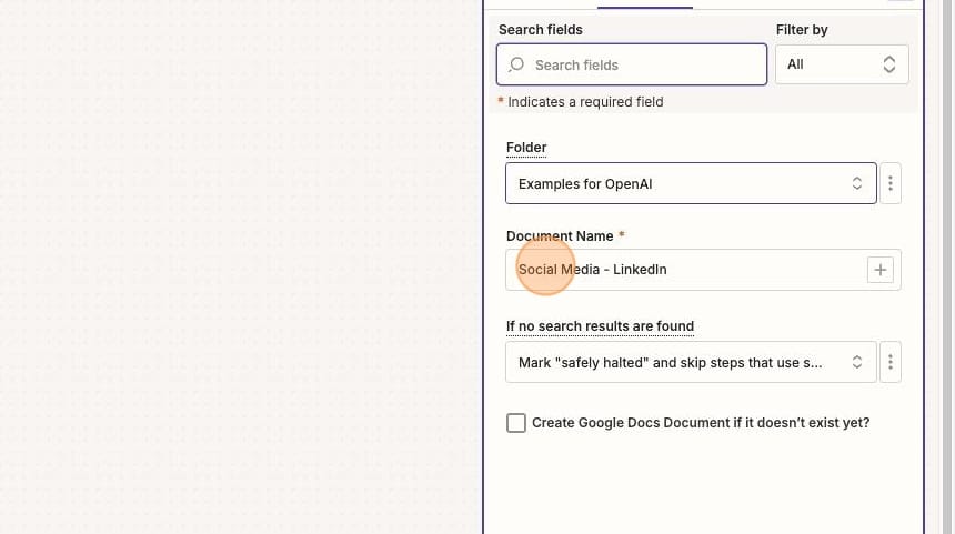 You'll then search for and select your Google Doc — the same way you did in the prior Zap. Except this time, you're only searching instead of appending the document.
