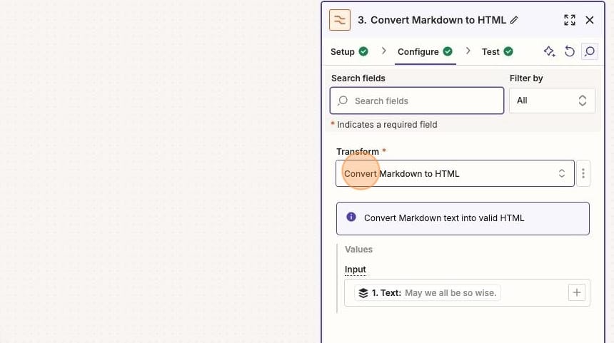 You'll add the text to append to the document and you'll select the output from your Formatter step: the text converted to HTML