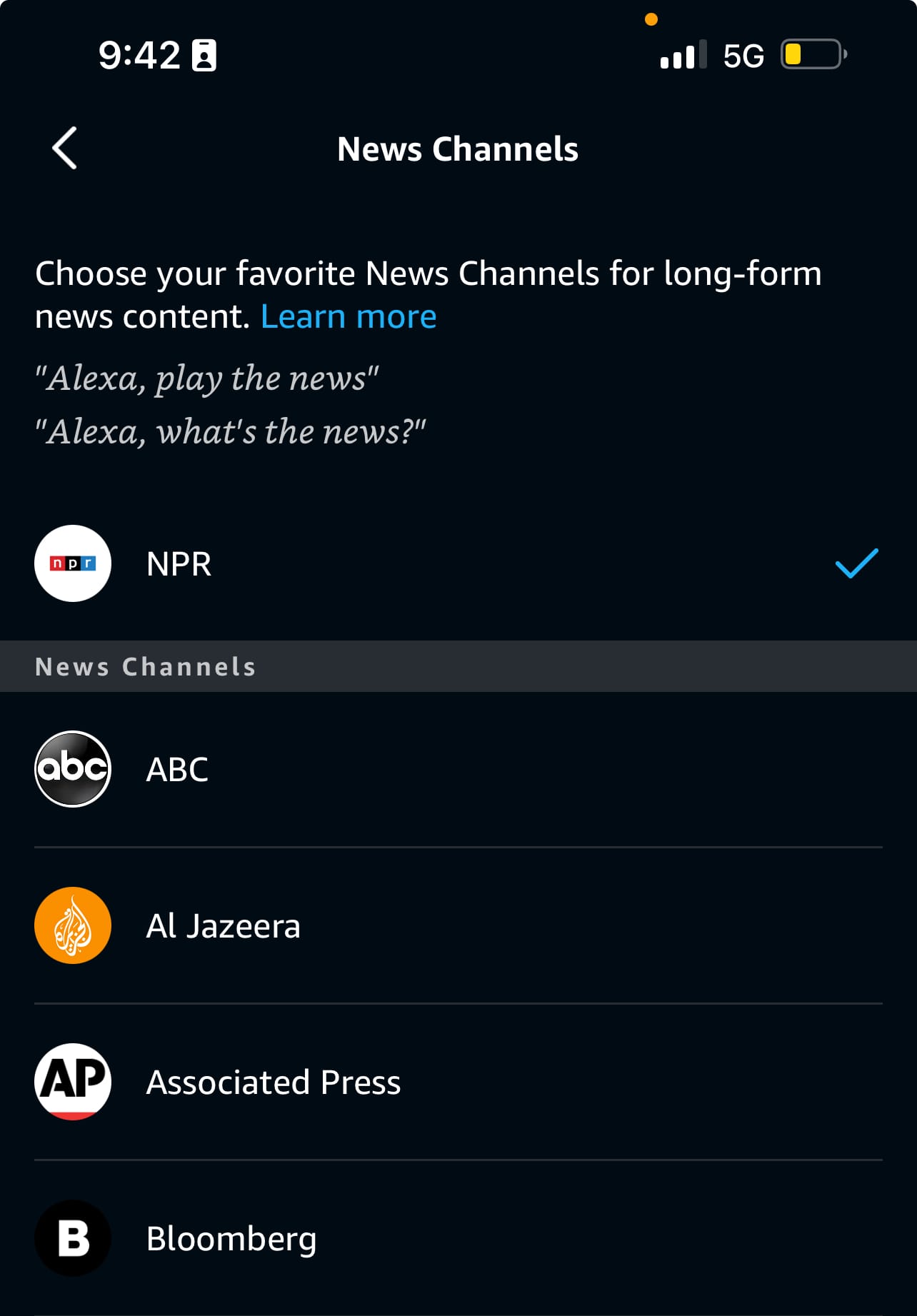 Alexa can do the same thing, in microdoses – and you can select your news sources in the Alexa app. I like my morning news to be brief, so I only have NPR selected but there are dozens to choose from.