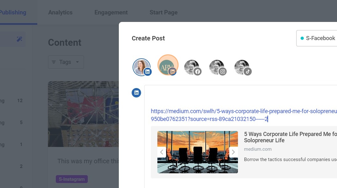 Here, I've selected two profiles. Then I would type the text for my post. The link is already there for me! And it looks great!